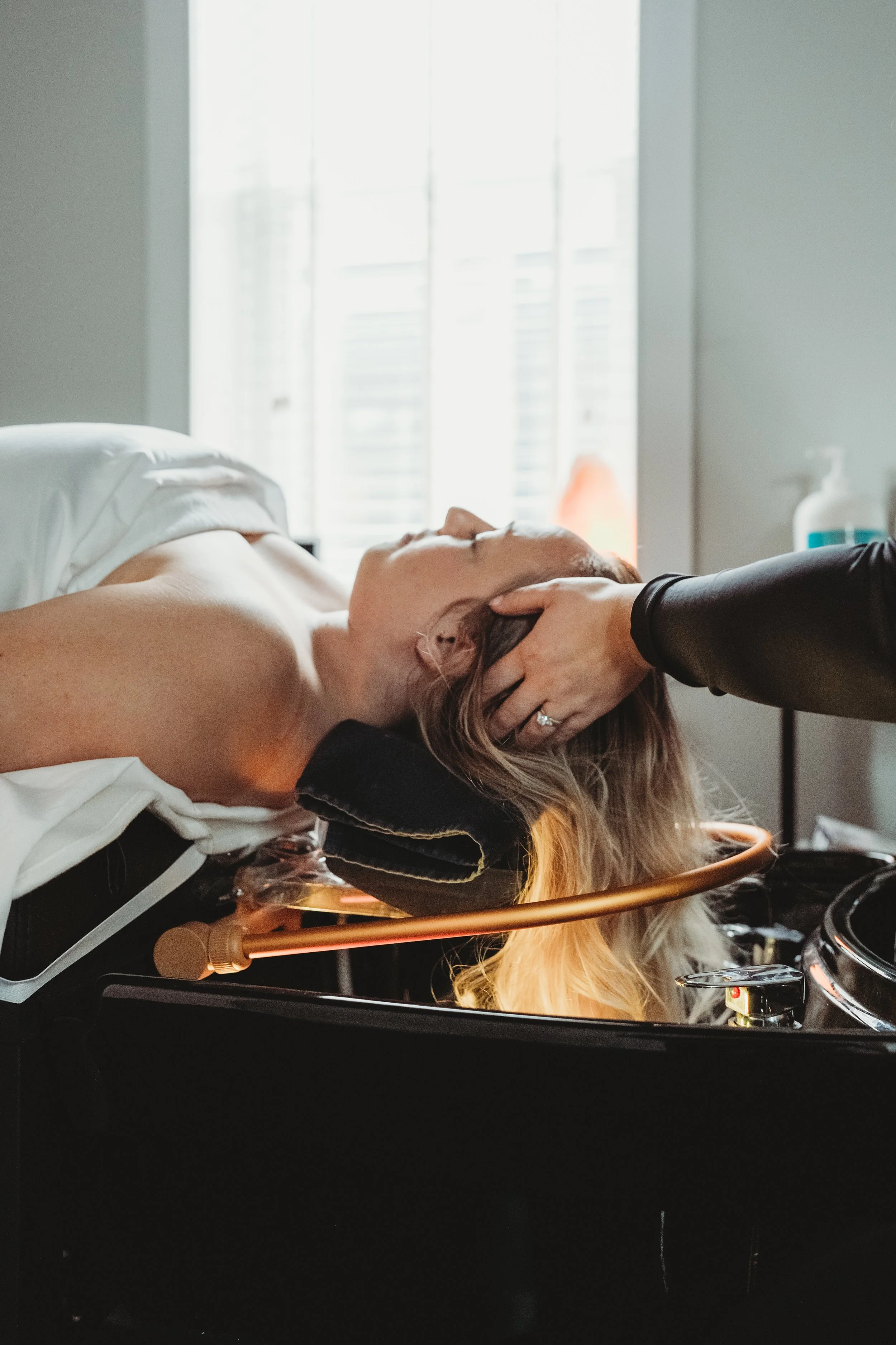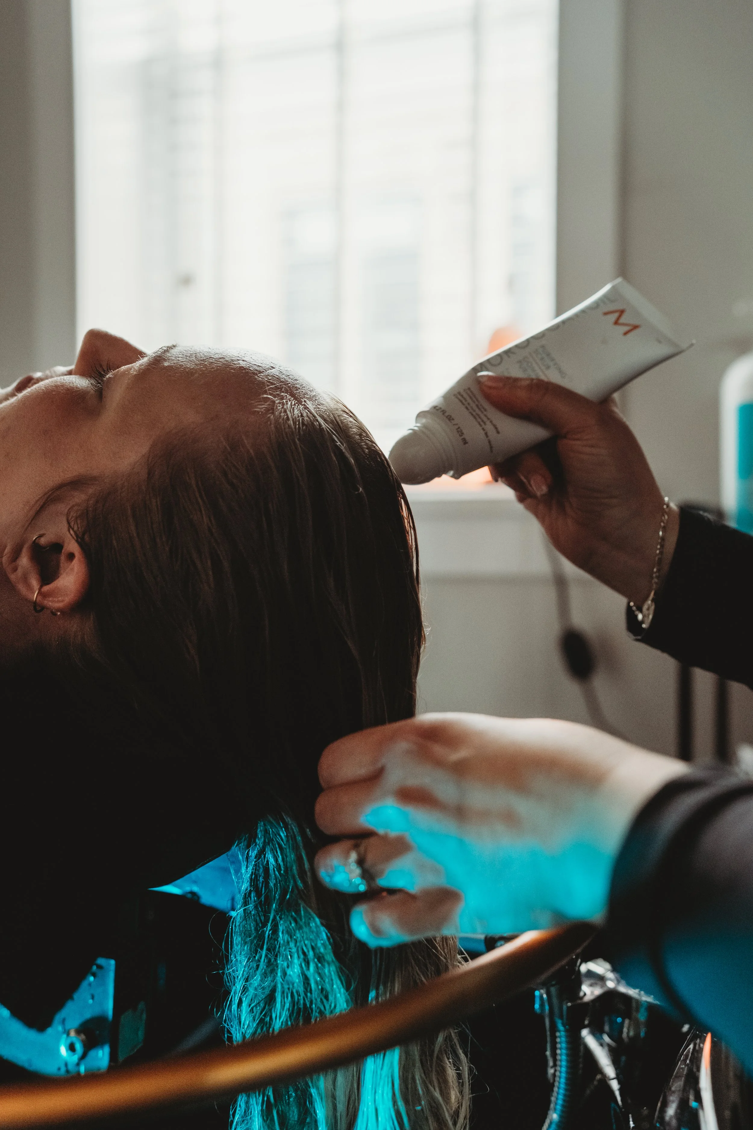 Step into a private head spa room for a personalized scalp analysis designed to address dryness, buildup, sensitivity, and overall scalp health. Each head spa treatment includes a slow, soothing cleanse, warm steam therapy, targeted scalp massage, and a deep-conditioning ritual using premium Moroccanoil products - restoring balance to your scalp while calming your mind. Every head spa experience finishes with a custom blow-dry, so you leave feeling refreshed, relaxed, and effortlessly beautiful.